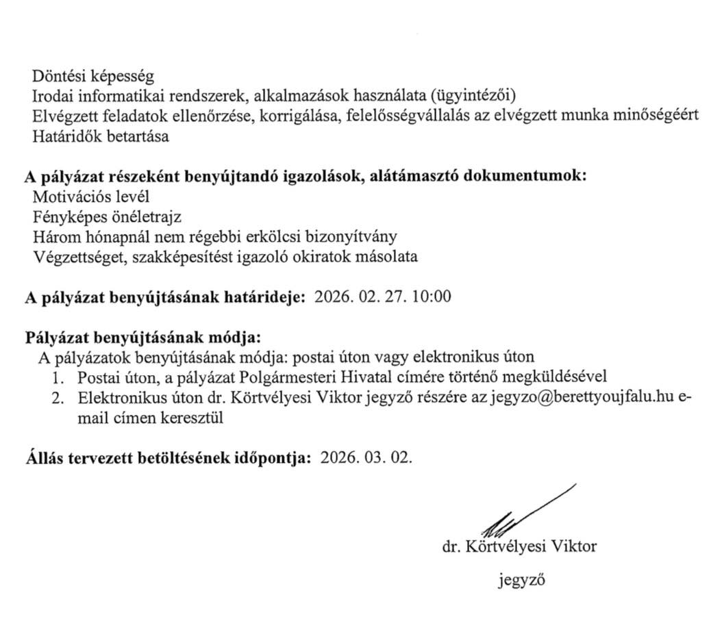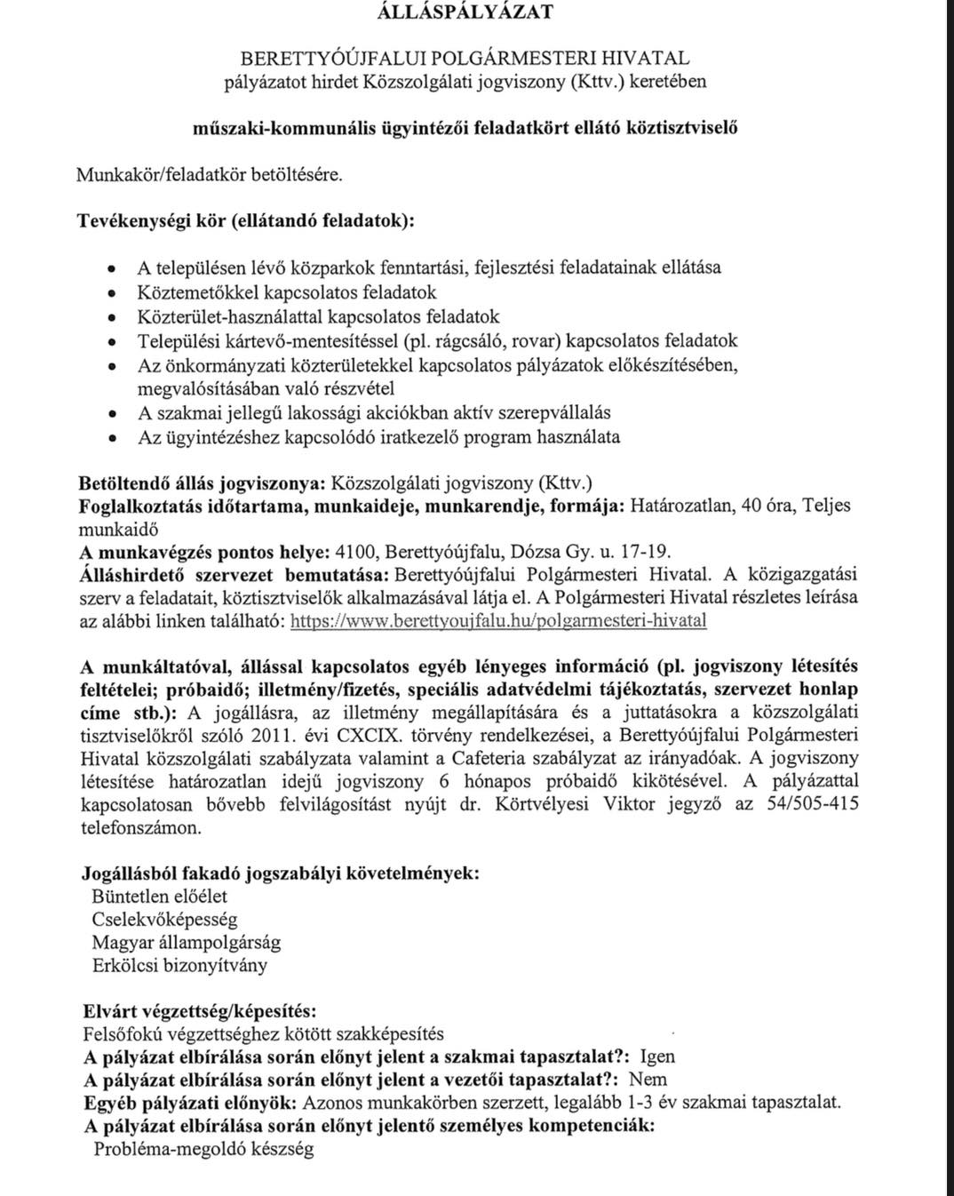 Müszaki-kommunális ügyintéző munkatársat keres a Berettyóújfalui Polgármesteri Hivatal.