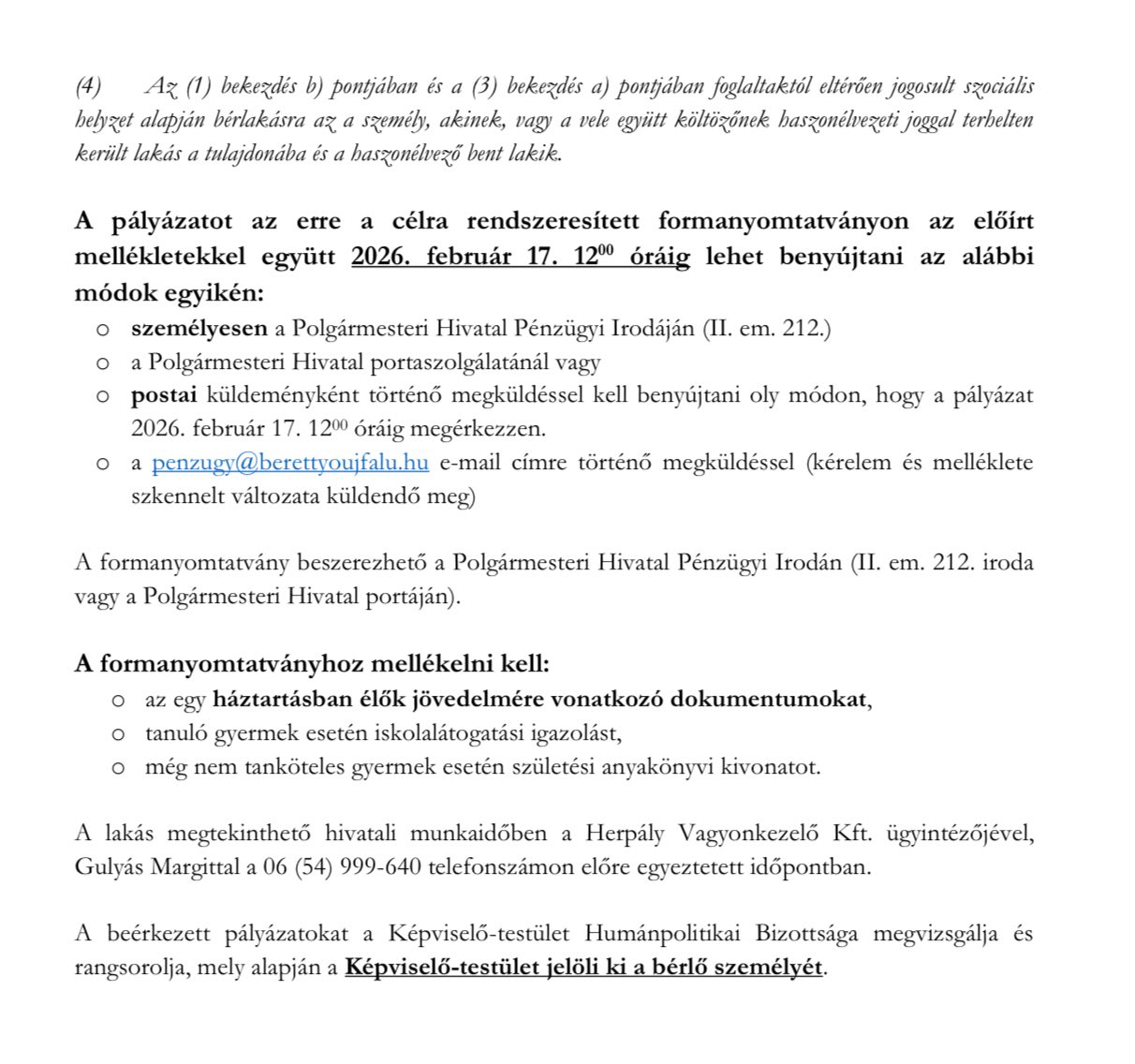 Berettyóújfalu Város Önkormányzata Képviselő-testületének 12/2022.(VII.1.) számú „Az önkormányzat tulajdonában álló lakások és helyiségek bérletére, valamint az elidegenítésükre vonatkozó szabályokról” önkormányzati rendelete alapján Berettyóújfalu Város Önkormányzata pályázatot ír ki az alábbi önkormányzati lakás, bérleti jogának szociális alapon történő elnyerése céljából a következő feltételekkel: