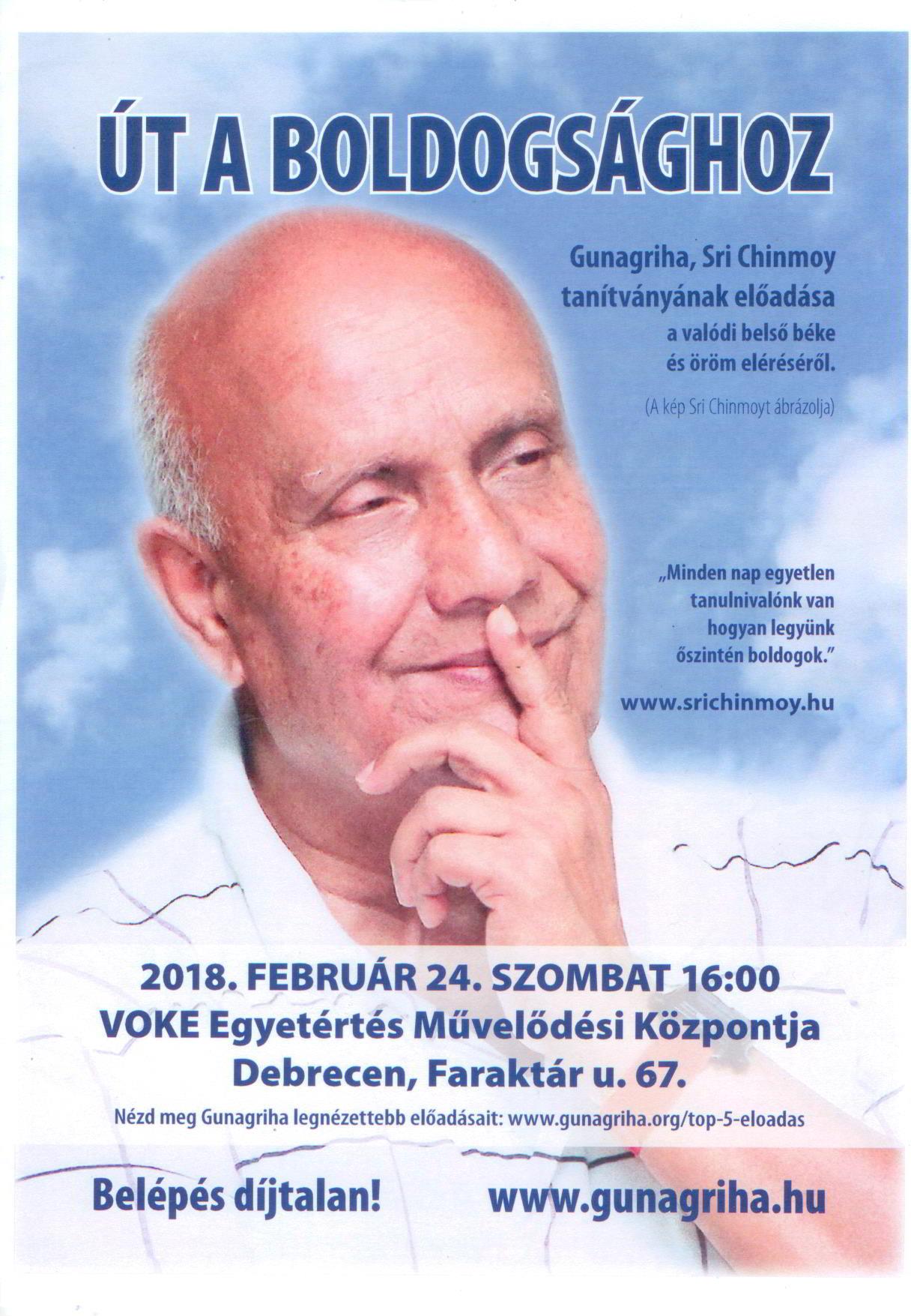 Gunagriha, Sri Chinmoy tanítványának előadása a valódi belső béke és öröm eléréséről. Időpont: 2018. február 24. szombat 16 óra. Helyszín: VOKE Egyetértés Művelődési Központja, Debrecen, Faraktár u. 67. A belépés díjtalan!