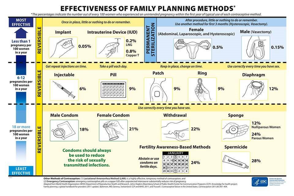 Az egyes fogamzásgátlási módszerek természetesen a más hatásfokkal védenek a nem kívánt terhességektől. Ezt az alábbi ábra szemlélteti, ahol a bal oldalon a 100, ilyen módszert használó nő közül azok száma látható, akik a módszer ellenére teherbeestek. Így tehát az ábrán felülről lefelé haladva az egyre kevésbé hatékony módszereket találjuk.