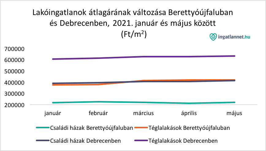 Például hatalmas nagy az árbeli differencia a berettyói házak/lakások és a debreceni házak/lakások között. Idén májusban egy Berettyóújfaluban eladó ház átlagos kínálati ára 220 ezer Ft/m2 volt, Debrecenben pedig 420 ezer Ft/m2. A két település májusi lakáspiaci árai pedig 420 ezer Ft/m2-nél és 630 ezer Ft/m2-nél álltak meg, természetesen a megyeszékhely javára.