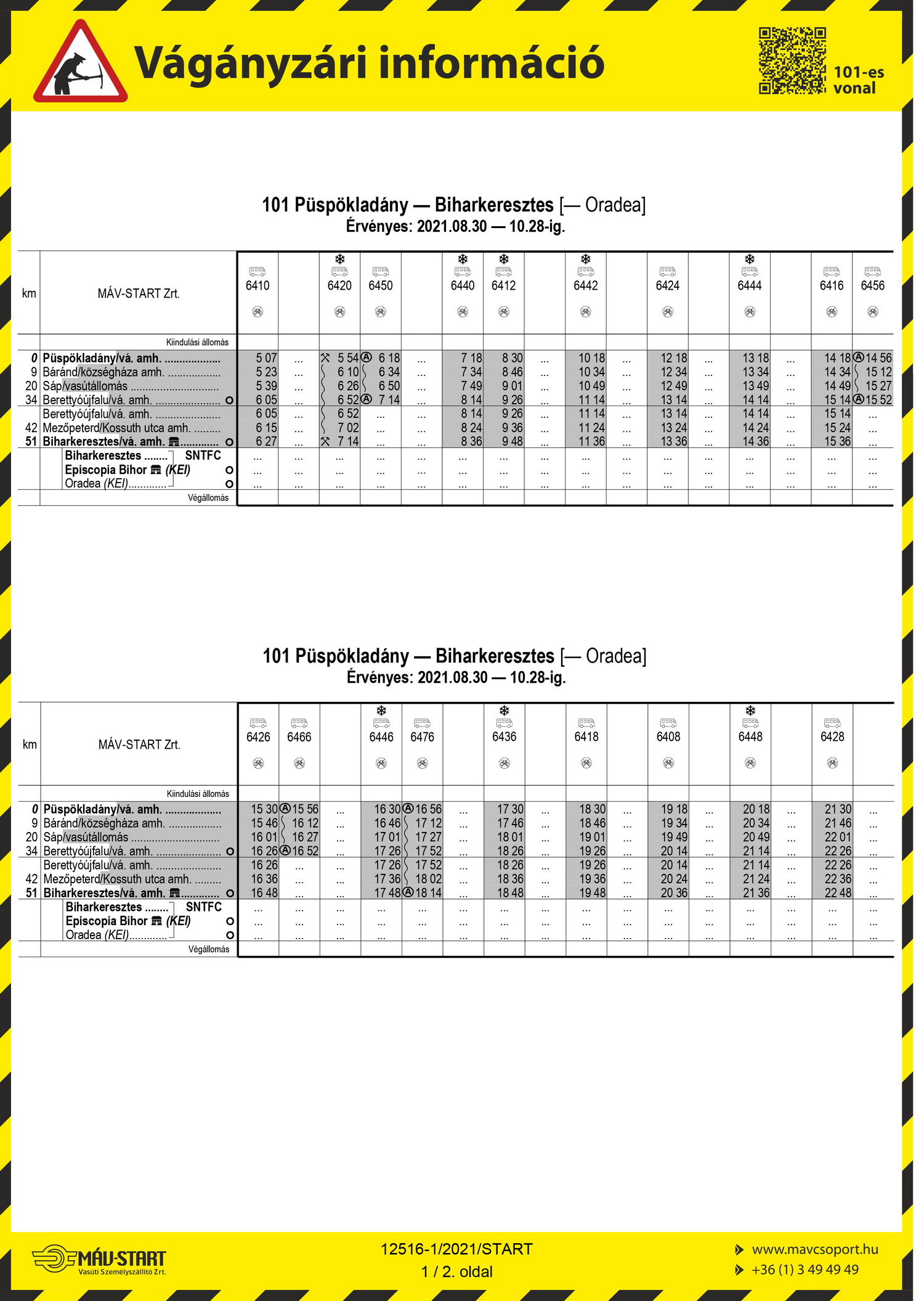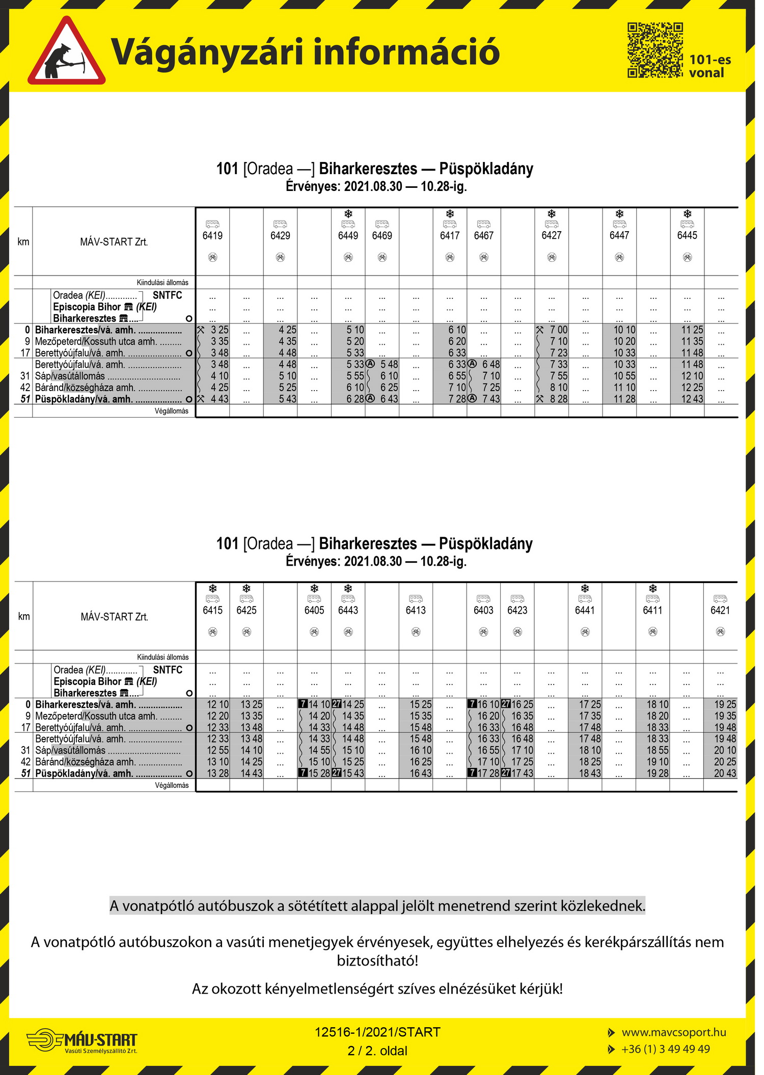 2021. augusztus 30-tól 2021. október 28-ig Püspökladány - Biharkeresztes állomások között végzett pályakarbantartási munkák miatt a 101 Püspökladány - Biharkeresztes [- Oradea] vasútvonalon a vonatok helyett a hirdetményben feltüntetett vonatpótló autóbuszok közlekednek.