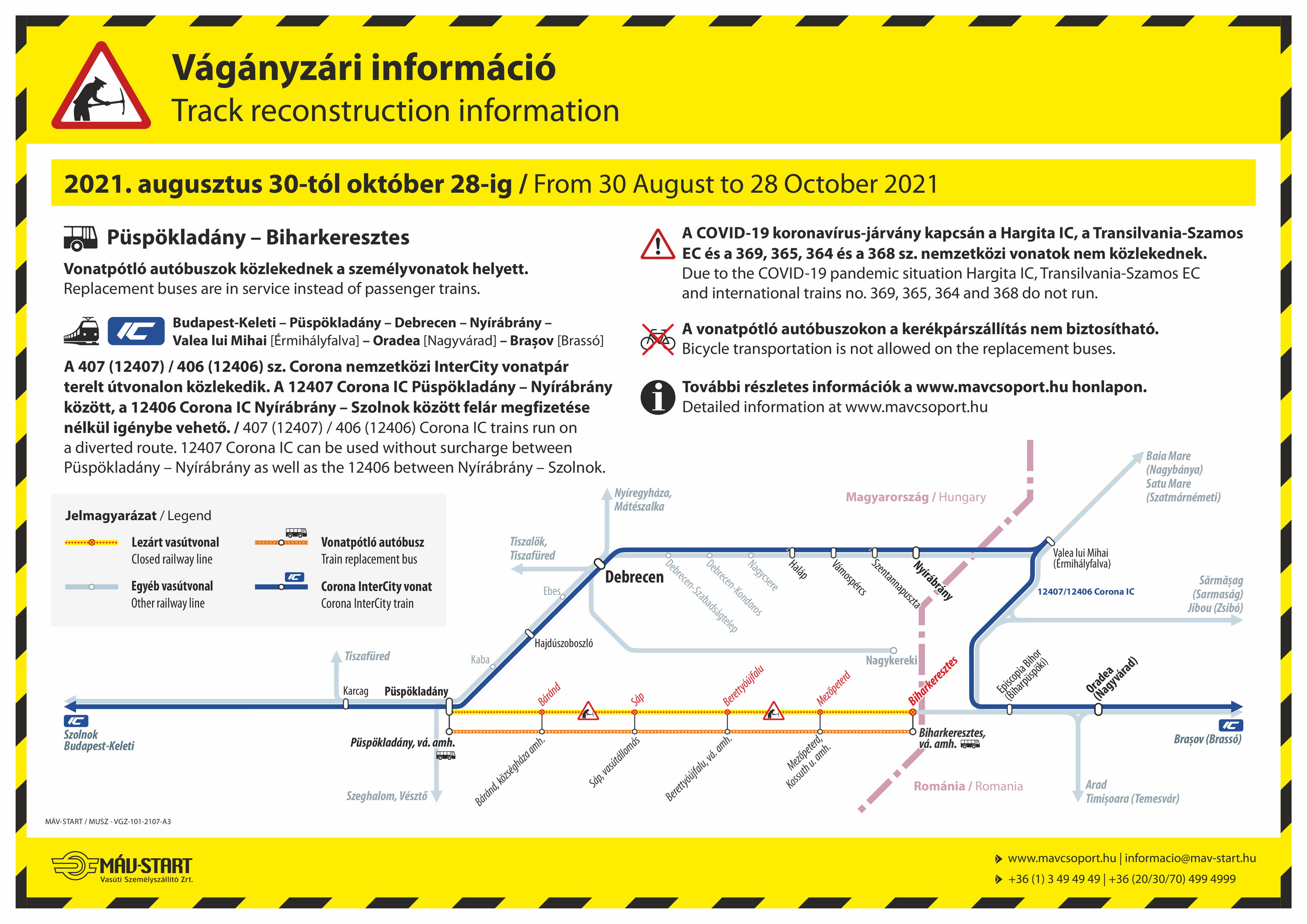 A COVID-19 koronavírus-járvány veszélyhelyzet kapcsán az IC367/366 HARGITA, EC143/144 TRANSILVANIA és a 369, 365, 364, 368 sz. nemzetközi vonatok nem közlekednek.