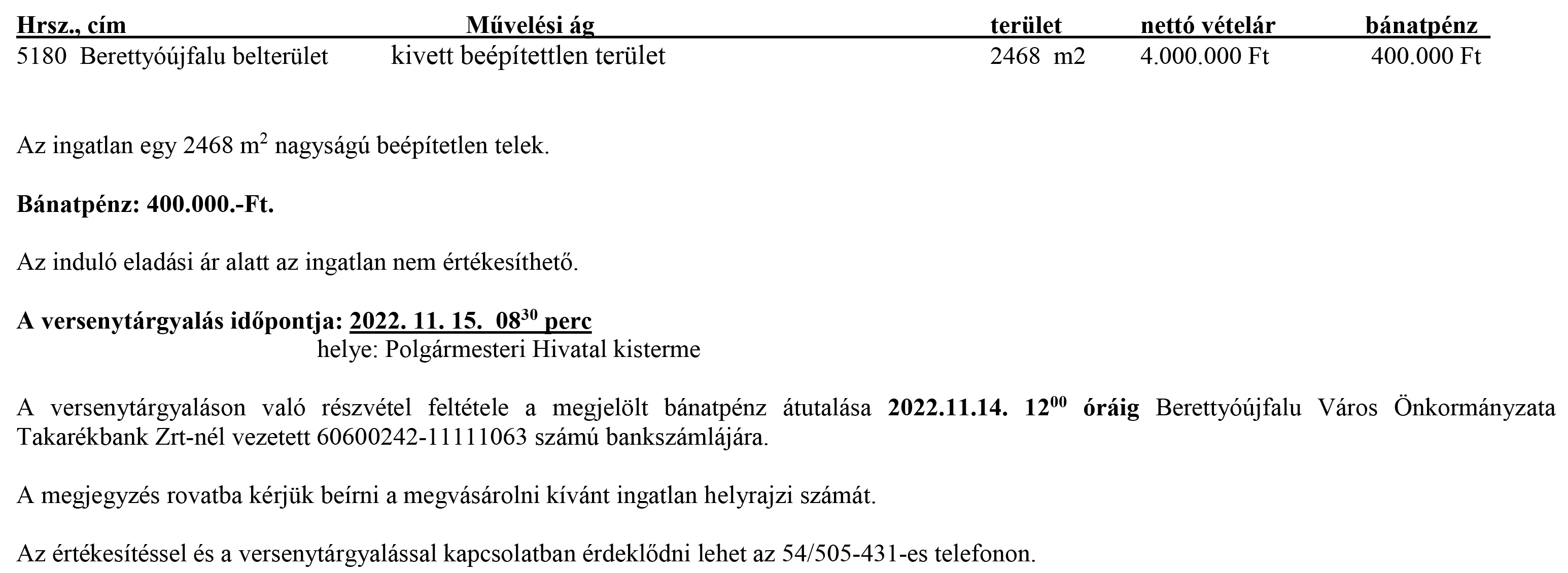 Berettyóújfalu Város Önkormányzata meghirdeti eladásra az alábbi ingatlant versenytárgyalás útján történő értékesítéssel: