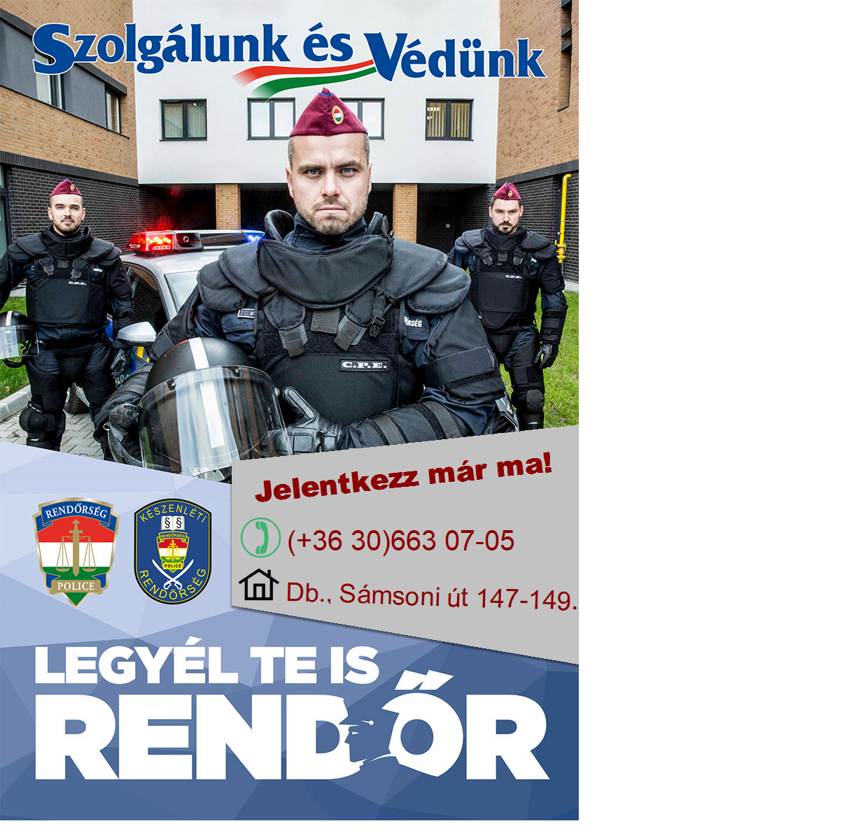 A Készenléti Rendőrség felvételt hirdet a 2024. májusban induló 10 hónapos közbiztonsági rendőr-járőr képzésre. A részletekkel kapcsolatban tájékozódjon az alábbi telefonszámon, vagy személyesen 2024. 04. 06-án (szombaton) 13.00 órától 15.00 óráig a Berettyóújfalu, Szent István tér 11. szám alatti Rendezvényházban, a Készenléti Rendőrség munkatársainál.