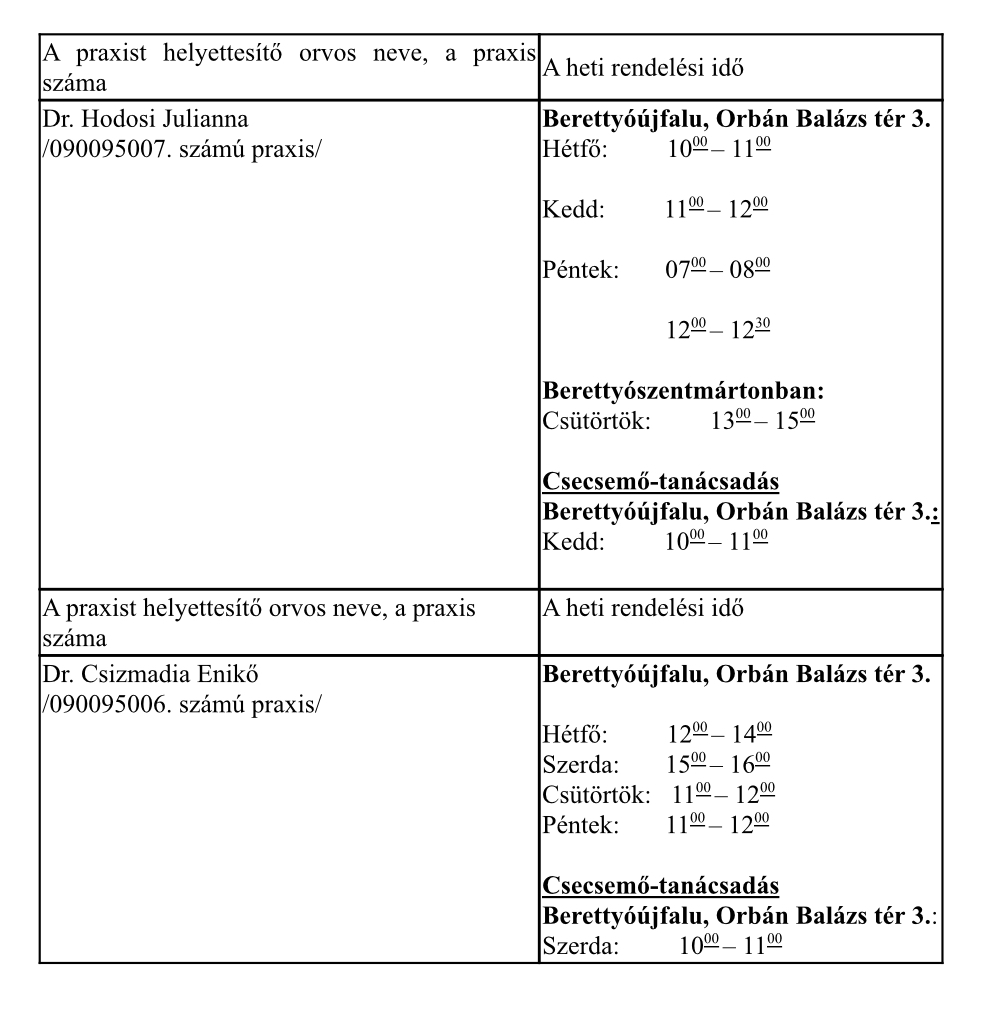 A fenti helyettesítési rendelési idők a gyermekorvosok nyári szabadsága alatt nem érvényesek, ezidő alatt minden munkanap egy gyermekorvos rendel 8-16 óra között a Berettyóújfalu, Orbán Balázs tér 3. szám alatti rendelőben.