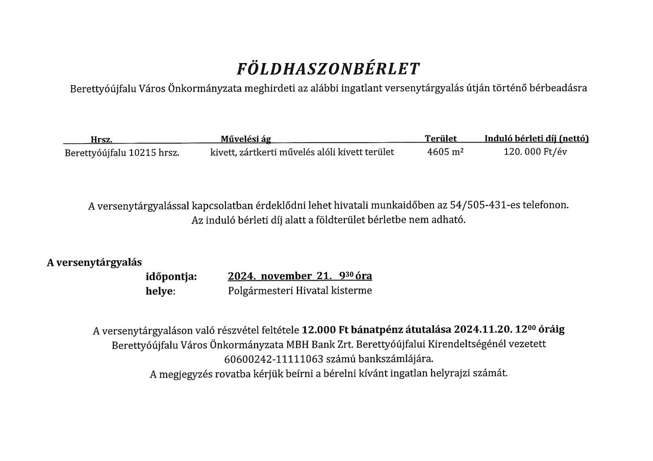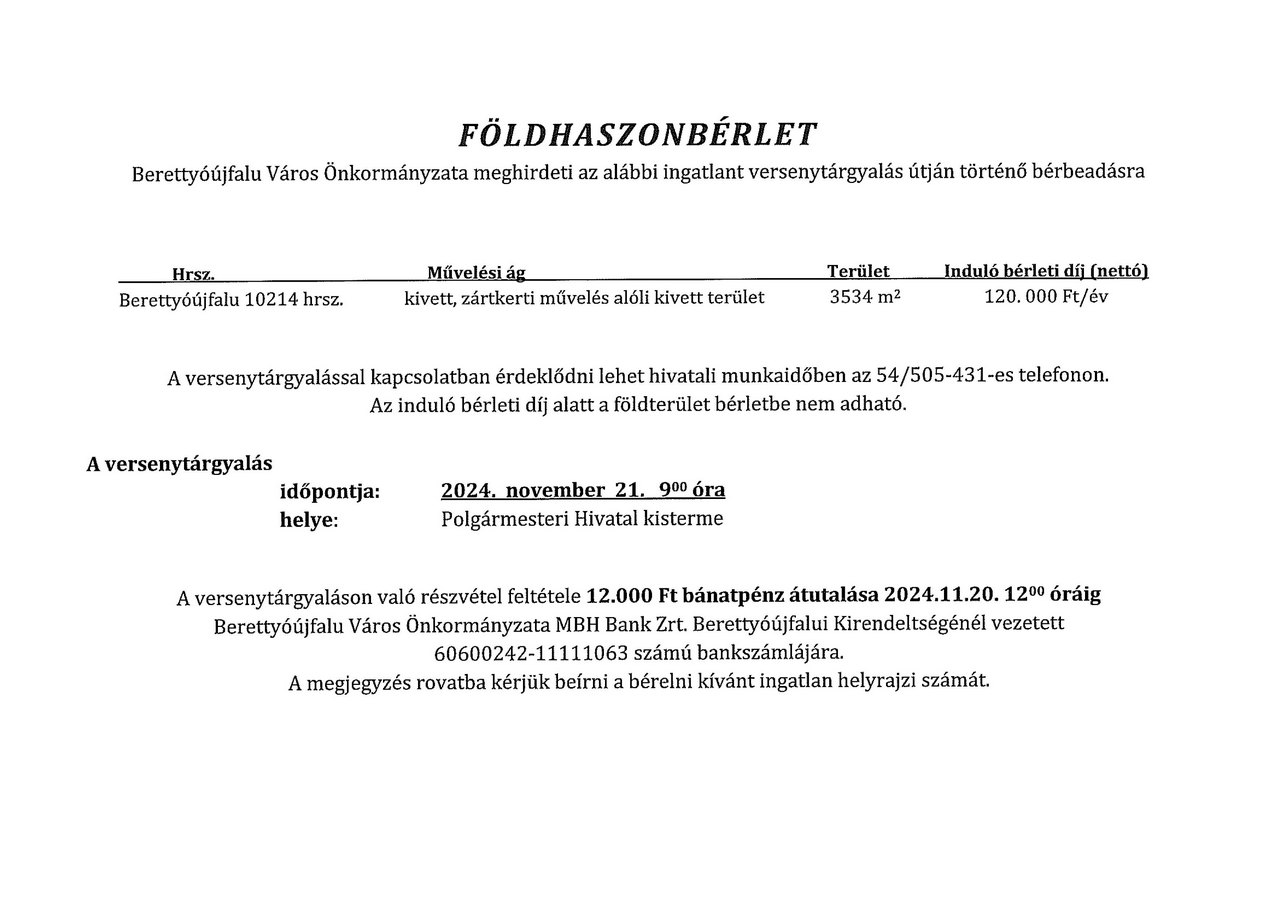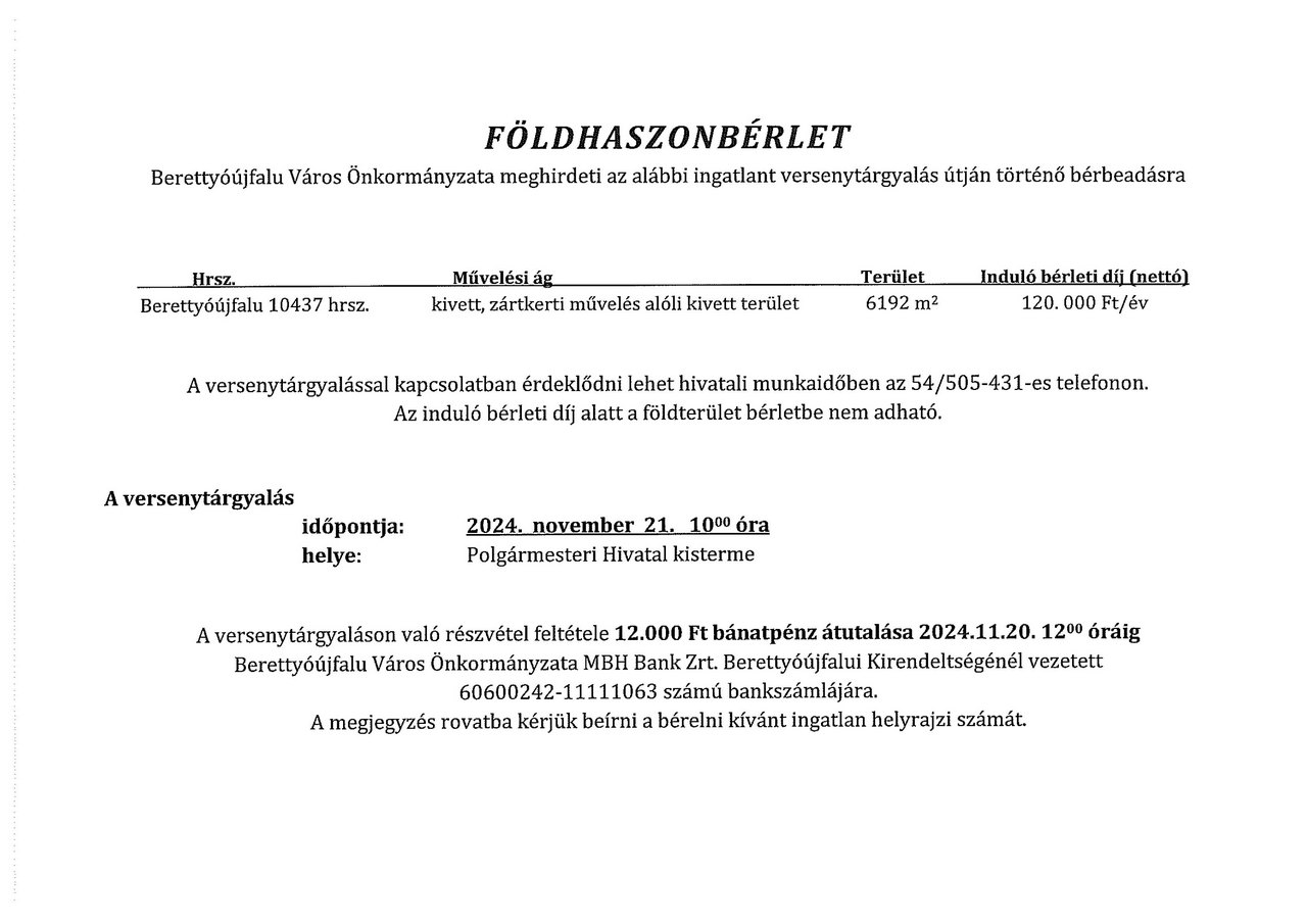 Berettyóújfalu Város Önkormányzata meghirdeti az alábbi ingatlanokat versenytárgyalás útján történő bérbeadásra.