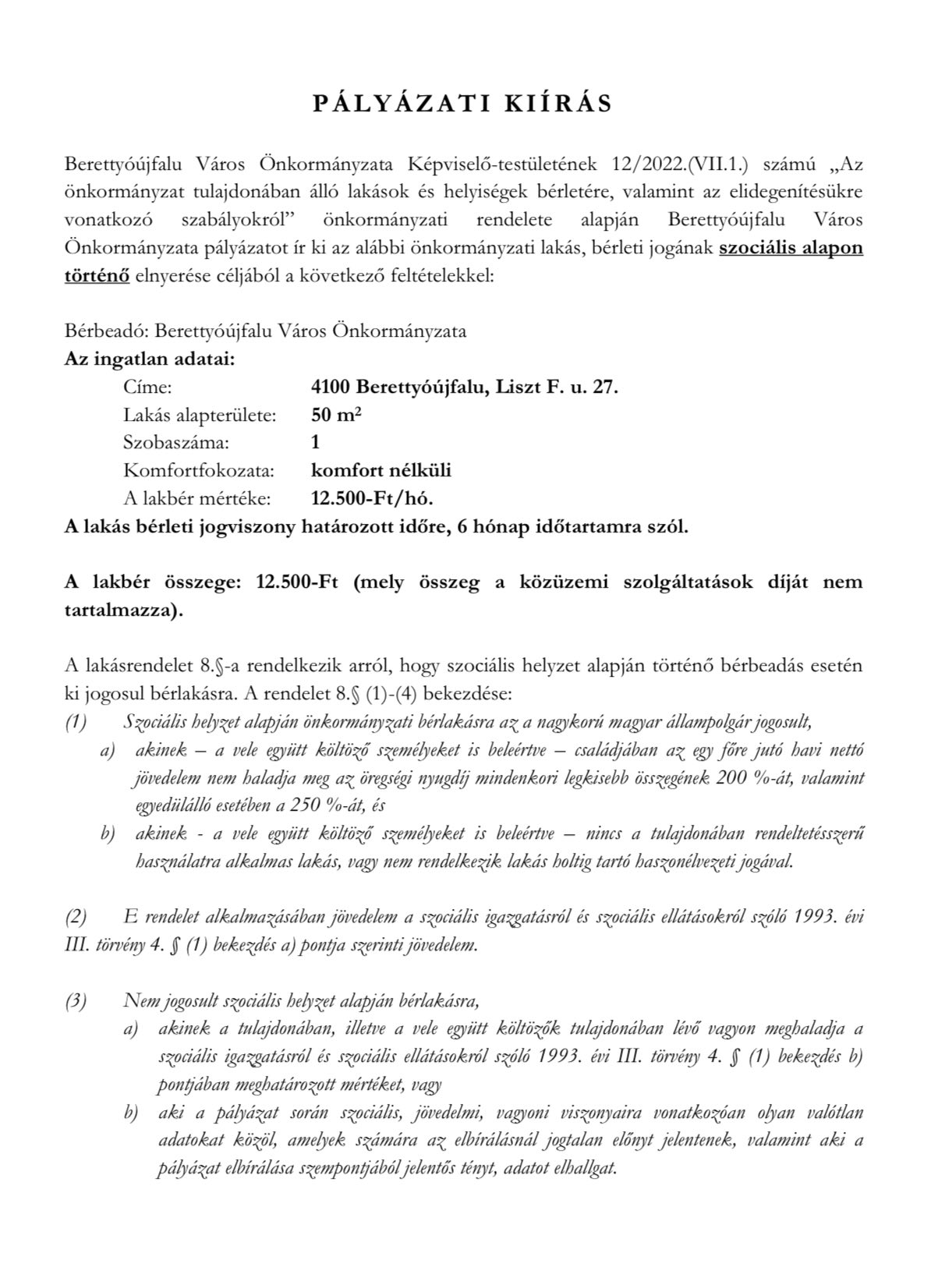 Berettyóújfalu Város Önkormányzata Képviselő-testületének 12/2022.(VII.1.) számú „Az önkormányzat tulajdonában álló lakások és helyiségek bérletére, valamint az elidegenítésükre vonatkozó szabályokról” önkormányzati rendelete alapján Berettyóújfalu Város Önkormányzata pályázatot ír ki az alábbi önkormányzati lakás, bérleti jogának szociális alapon történő elnyerése céljából a következő feltételekkel:
