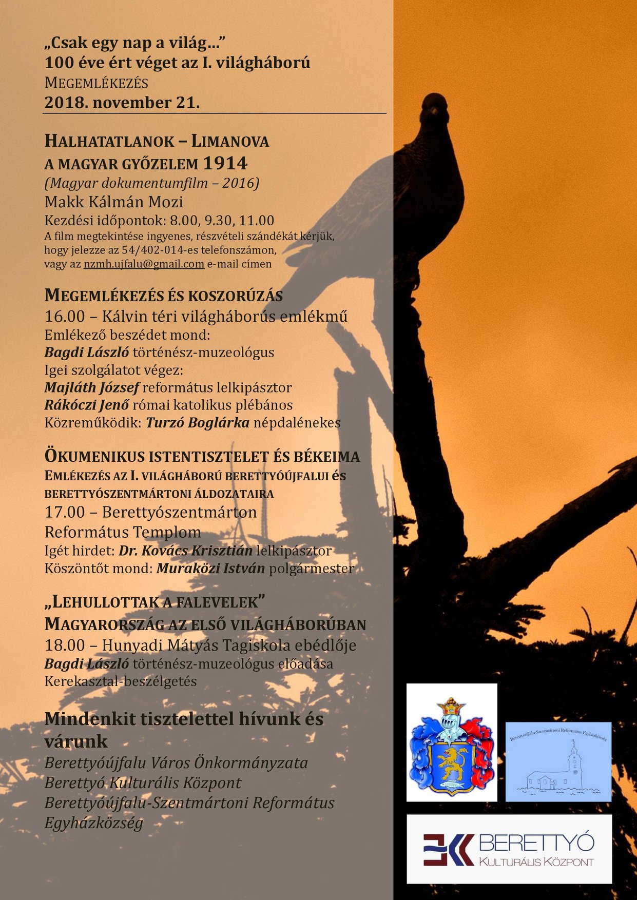 Berettyóújfalu Város Önkormányzata, a Berettyó Kulturális Központ és a Berettyóújfalu-Szentmártoni Református Egyházközség mindenkit tisztelettel hívnak és várnak 2018. november 21-én, a 100 éve véget ért I. világháborúhoz kapcsolódó megemlékezésre, programokra.