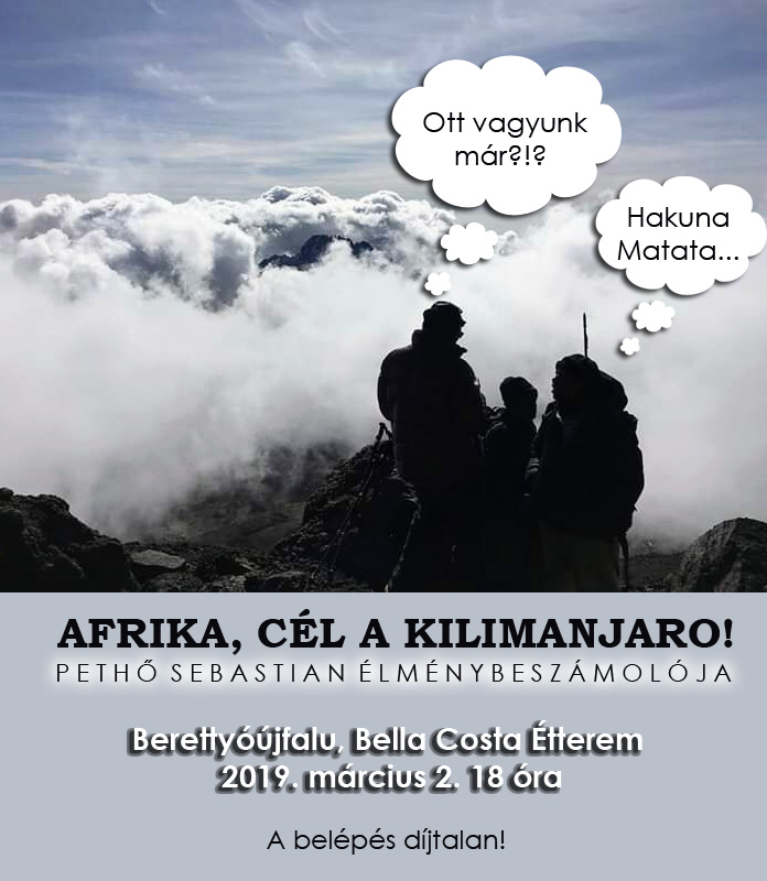 Legújabb kalandos utazásáról tart élménybeszámolót Pethő Sebastian 2019. március 2-án 18 órától Berettyóújfaluban, a Bella Costa étteremben. Ezúttal Afrikába, konkrétabban Tanzániába kalauzolja az érdeklődőket, akik bepillantást kaphatnak a húszfős csapat tíznapos expedíciójának részleteibe, melynek fő célja a Kilimandzsáró meghódítása volt. Seba az utazáson készült fotói és videói mellett megosztja velünk a nem mindennapi túra során szerzett élményeit, megtudhatjuk mi adott erőt neki a legnehezebb pillanatokban, és mikor is értette meg igazán a "Hakuna Matata" kifejezés lényegét. A szervezők minden érdeklődőt szeretettel várnak, a belépés díjtalan! (Az esemény Facebook profilja IDE kattintva érhető el!)