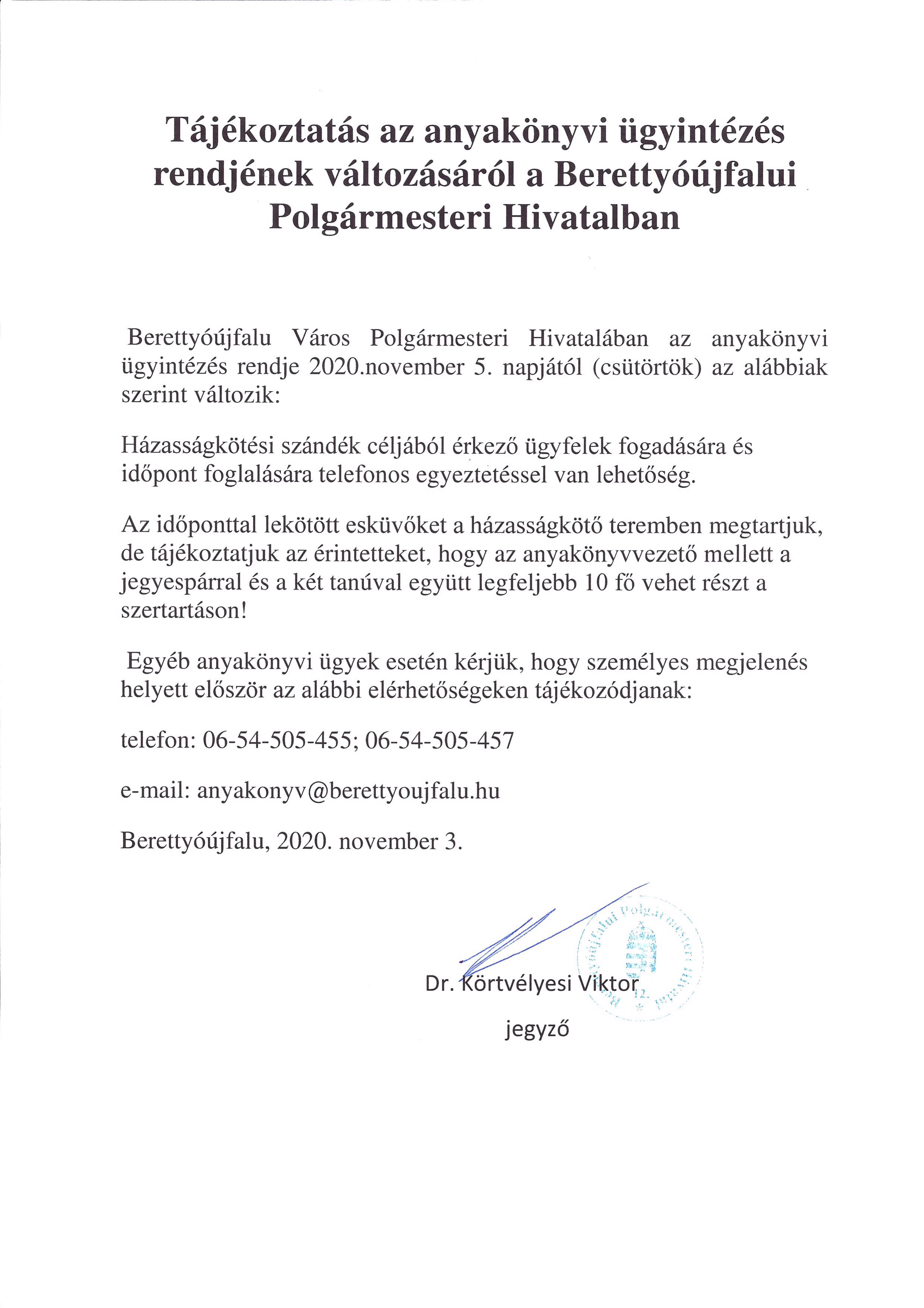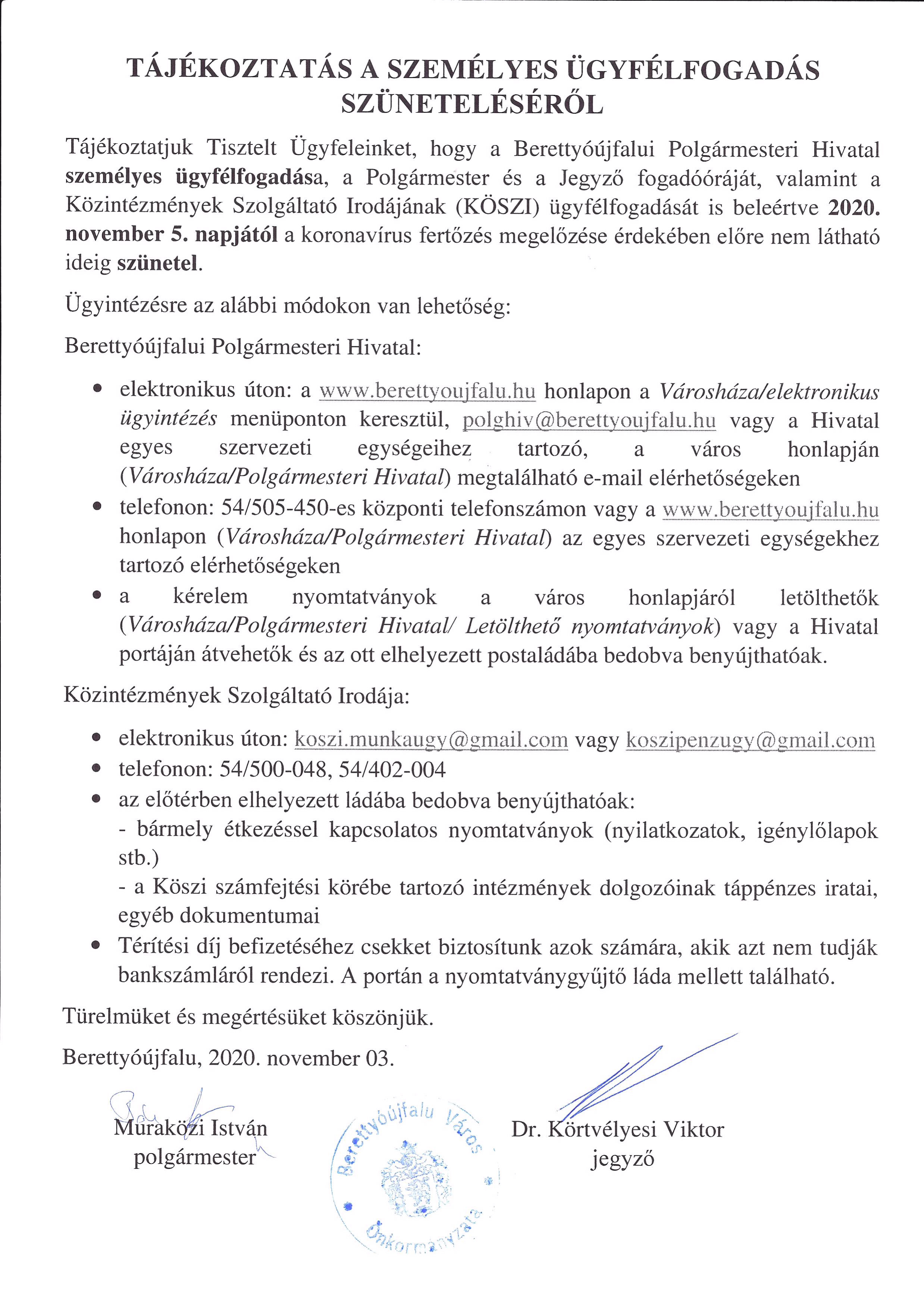 Tájékoztatjuk tisztelt Ügyfeleinket, hogy a Berettyóújfalui Polgármesteri Hivatal személyes ügyfélfogadása, a Polgármester és a Jegyző fogadóórája valamint a Közintézmények Szolgáltató Irodájának (KÖSZI) ügyfélfogadása 2020. november 5. napjától a koronavírus fertőzés megelőzése érdekében előre nem látható ideig szünetel, továbbá az ANYAKÖNYVI ügyintézés rendje is módosul. Részletek az alábbi hirdetményekben.