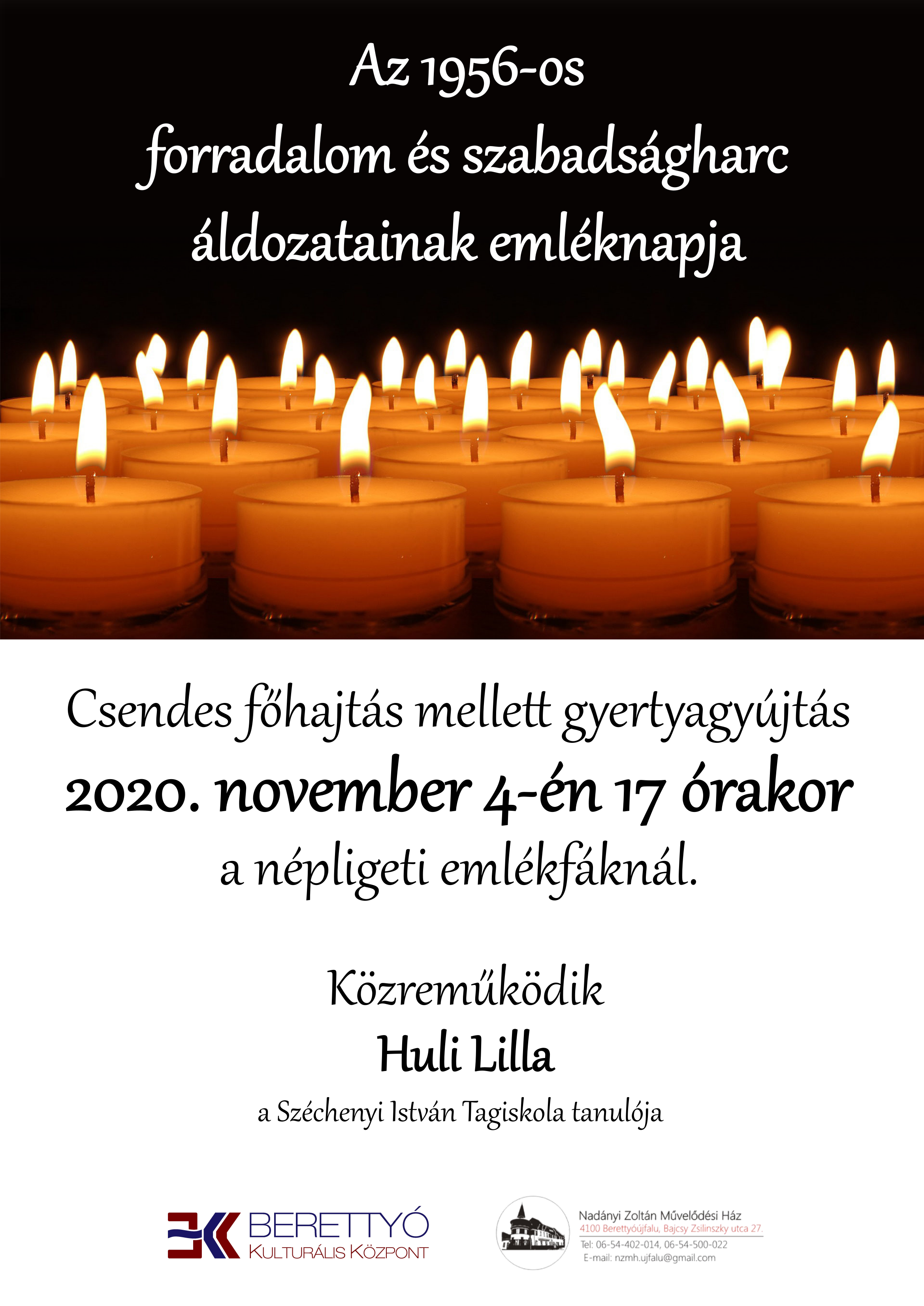 Berettyóújfalu Város Önkormányzata tisztelettel meghívja a város lakosságát az 1956-os forradalom és szabadságharc áldozatainak emléknapján tartandó megemlékezésre 2020. november 4-én.