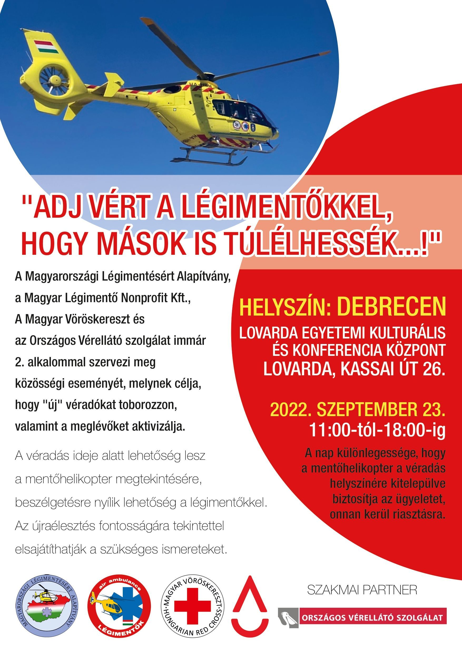 Immár 2. alkalommal indít rendhagyó közösségi véradókampányát a Magyarországi Légimentésért Alapítvány a Magyar Légimentő Nonprofit Kft.-vel közösen és a Magyar Vöröskereszt és szakmai partnere az Országos Vérellátó Szolgálat: egyszerre 7 helyszínen várják a véradókat szerte az országban!