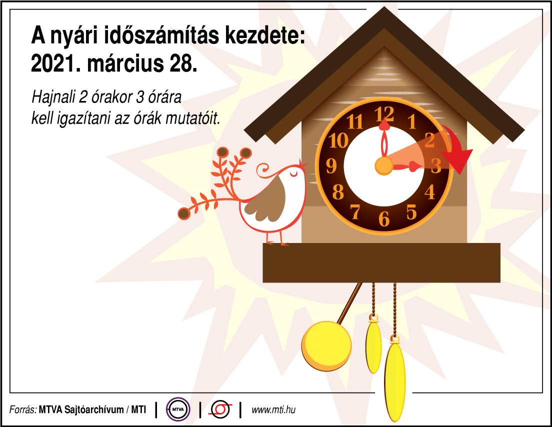Március 28-án, vasárnap hajnali 2 órakor egy órával előre, hajnali 3 órára kell átállítani az órákat, ezzel megkezdődik a nyári időszámítás. Még nincs döntés arról, hogy a téli vagy a nyári időszámítást használják-e az Európai Unió tagállamai - közölte az Innovációs és Technológiai Minisztérium (ITM) pénteken az MTI megkeresésére.
