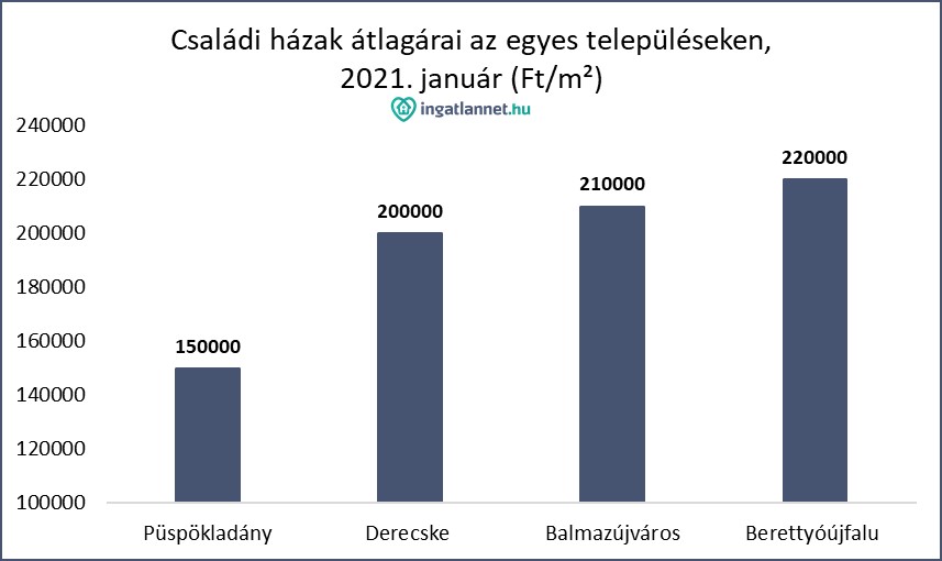 Az idei év kezdetén Hajdú-Bihar megye vizsgált településein egy családi házért átlagosan 150 és 380 ezer forintot kértek el négyzetméterenként. A cikk betekintést nyújt, hogy a megye egyes településein átlagosan mennyit kellet négyzetméterenként fizetniük az itt lakóingatlant vásárlóknak 2021 kezdetén.