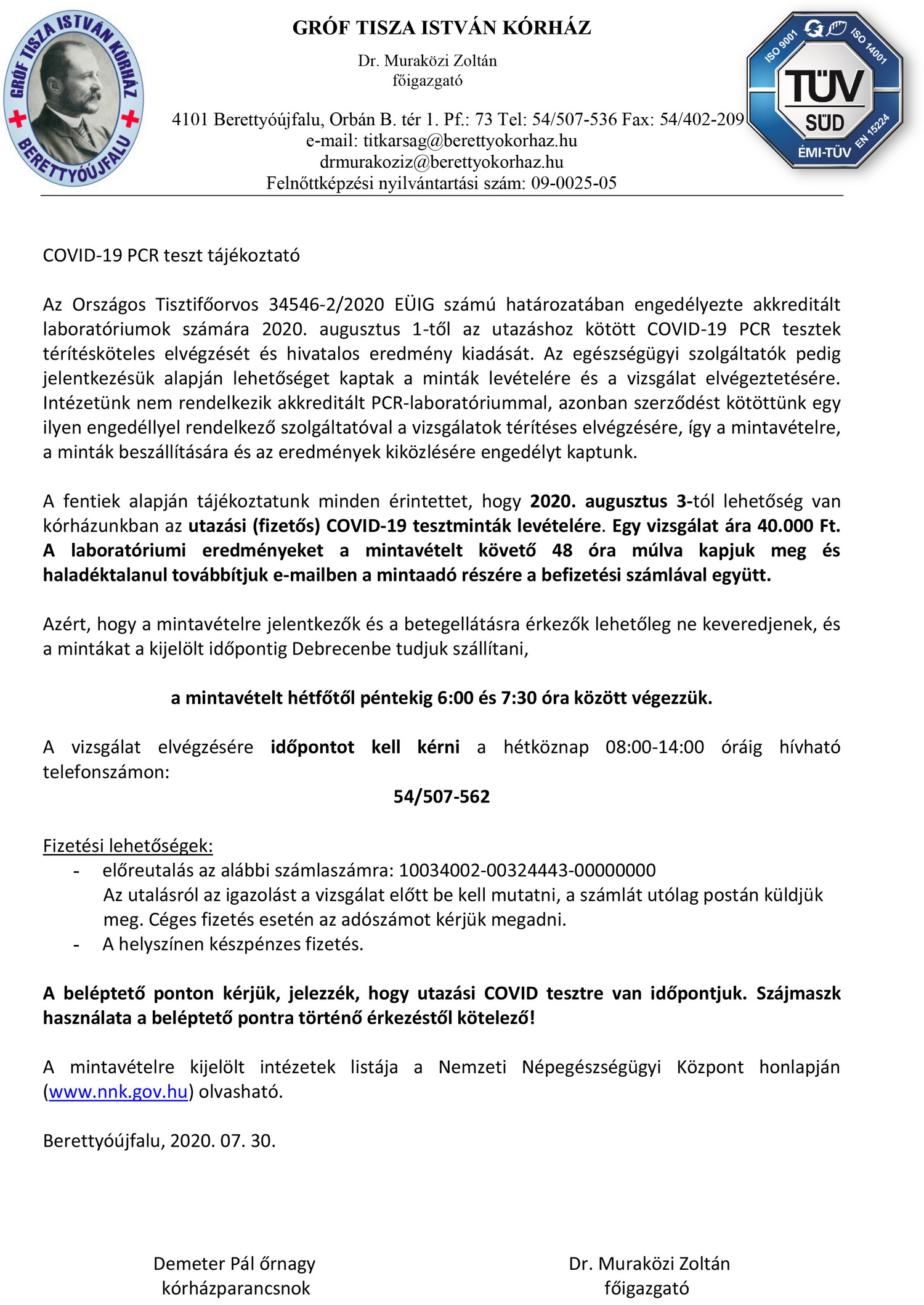 A fentiek alapján tájékoztatunk minden érintettet, hogy 2020. augusztus 3-tól lehetőség van kórházunkban az utazási (fizetős) COVID-19 tesztminták levételére. Egy vizsgálat ára 40.000 Ft. A laboratóriumi eredményeket a mintavételt követő 48 óra múlva kapjuk meg és haladéktalanul továbbítjuk e-mailben a mintaadó részére a befizetési számlával együtt.