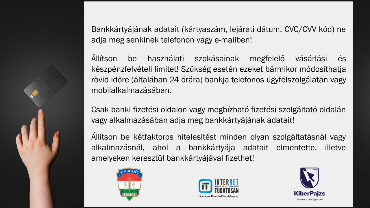 - Ne adja meg bankkártya vagy online banki adatait és ne küldjön másolatot okmányairól! A banknak elég a név, születési hely és idő, esetleg lakcím. A beazonosításhoz nem kell sem a bankszámlaszám, sem pedig a bankkártyaszám megadása.