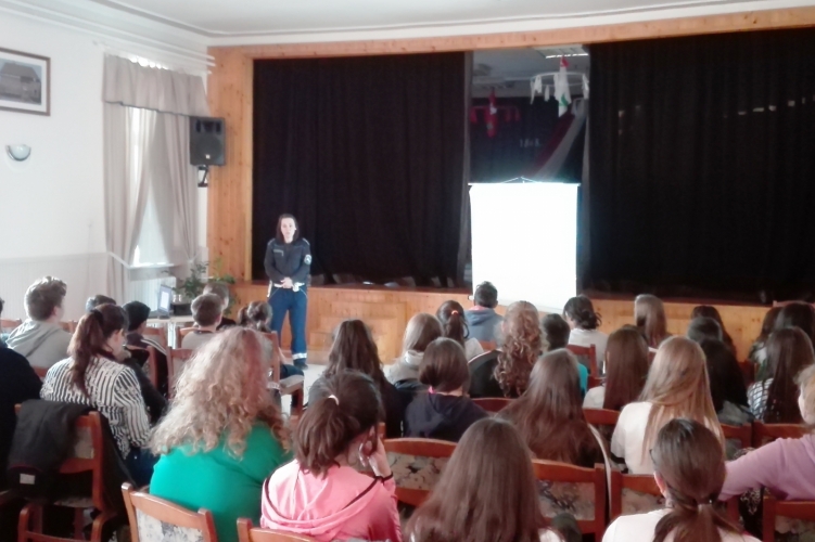A Berettyóújfalui Rendőrkapitányság munkatársa felső tagozatos diákok részére tartott baleset-megelőzési előadást.