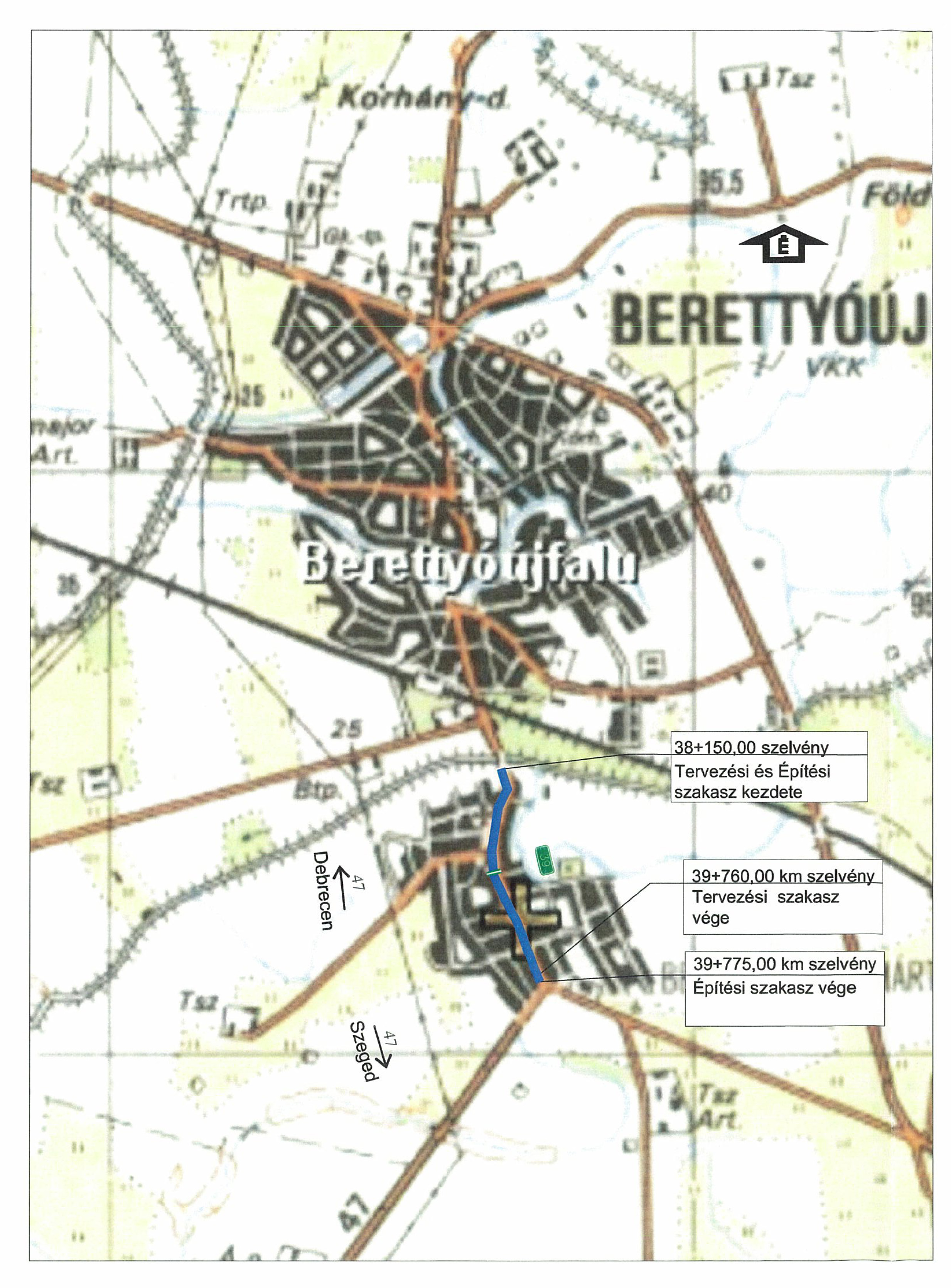A 47. sz. Debrecen - Szeged II. rendű főút 38+150 - 39+760 km szelvények (Berettyószentmártoni átkelési szakasz) közötti szakasz burkolatfelújításának áttekintő térképe, kattintásra NAGYÍTHATÓ!