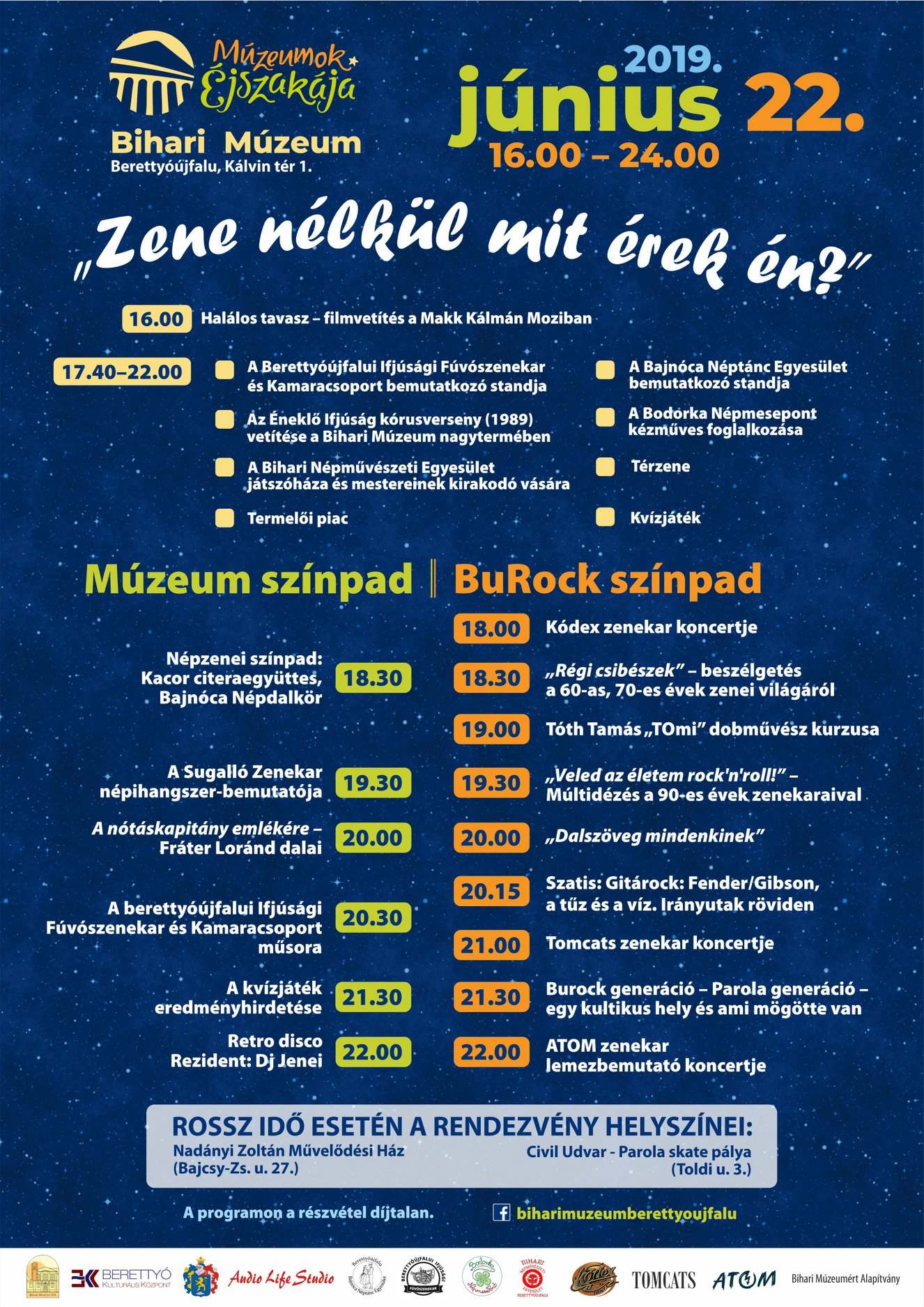 2019-ben a zene és a tánc körül "forog" minden, a komolyzenétől a népzenén keresztül a könnyűzenével bezárólag minden stílust igyekszünk megszólaltatni a Bihari Múzeumban és környékén! Két színpadon számos fellépő közül lehet válogatni, a termelői piacon hazait kóstolni, a moziban filmet nézni és nosztalgiázni, mert "Zene nélkül mit érek én?"!