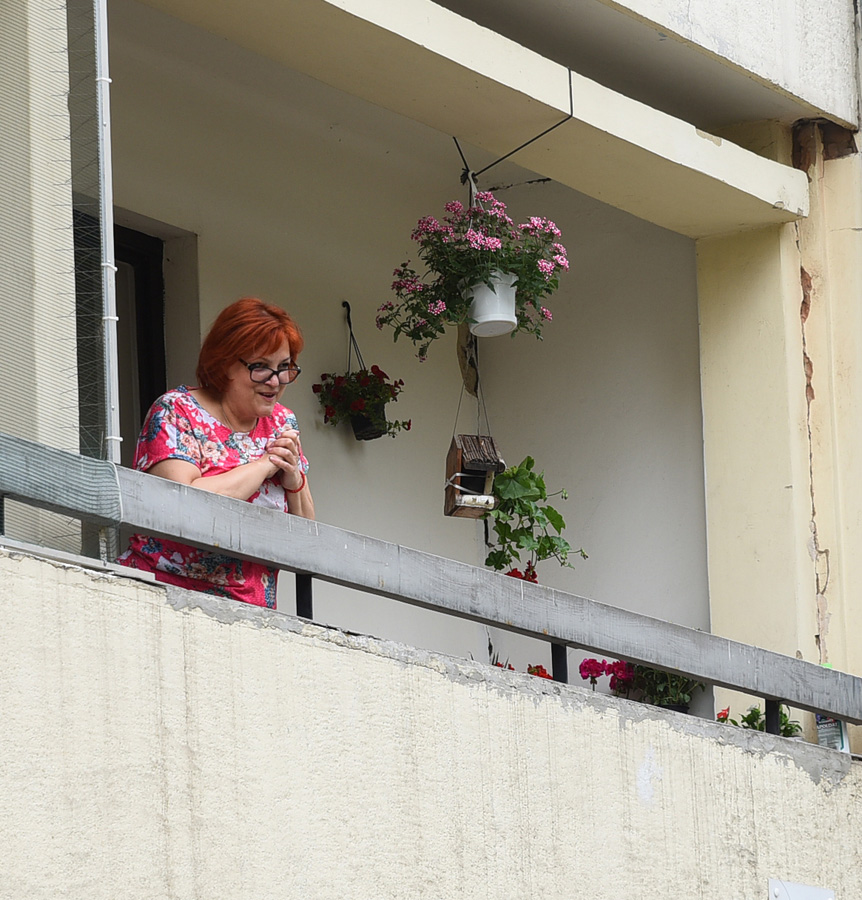 Igazi shakespeare-i erkély-jelenetet adtak elő, hisz Gemza Péter igazgató, a színészek és a munkatársak a művésznő Színészházbeli erkélye alatt énekeltek Takács Dániel tangóharmonika kíséretével.