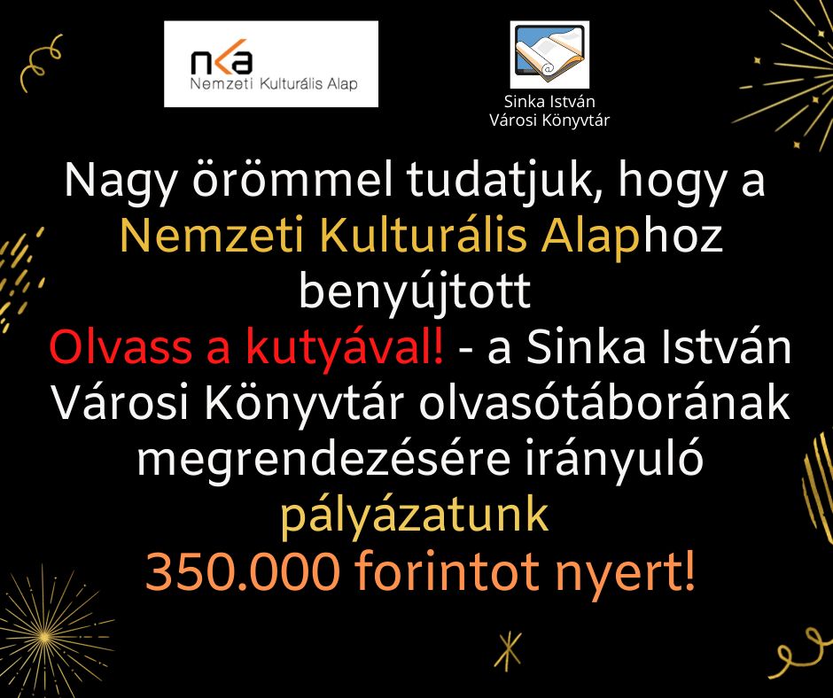 A Sinka István Városi Könyvtár nagy örömmel tudatja, hogy a Nemzeti Kulturális Alaphoz benyújtott Olvass a kutyával! – a Sinka István Városi Könyvtár olvasótáborának megrendezésére irányuló pályázaton 350.000 Ft támogatást nyertek!