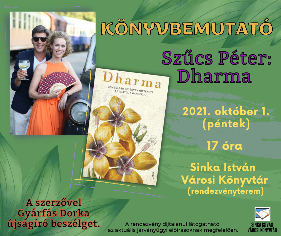 Zsúfolásig megtelt a Sinka István Városi Könyvtár előadóterme 2021. október 1-jén este, amikor a berettyóújfalui Szűcs Péter - Gyárfás Dorka újságíró beszélgetőpartnerével – szülővárosa közönségének is bemutatta Dharma című regényét. KÉPGALÉRIA