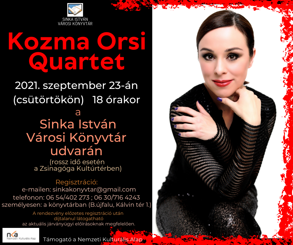 2021. szeptember 23-án, 18 órától Kozma Ortsi Quartet koncert lesz a Sinka István Városi Könyvtár udvarán (rossz idő esetén a Zsinagóga Kultúrtérben). A koncert ingyenes, de a részvétel előzetes regisztrációhoz kötött. Regisztrálni lehet személyesen a könyvtárban, telefonon (06 54/402 273; 06 30/716 4243) vagy e-mailben (Ez az e-mail-cím a szpemrobotok elleni védelem alatt áll. Megtekintéséhez engedélyeznie kell a JavaScript használatát.). Regisztráláshoz elegendő a résztvevő nevét megadni.