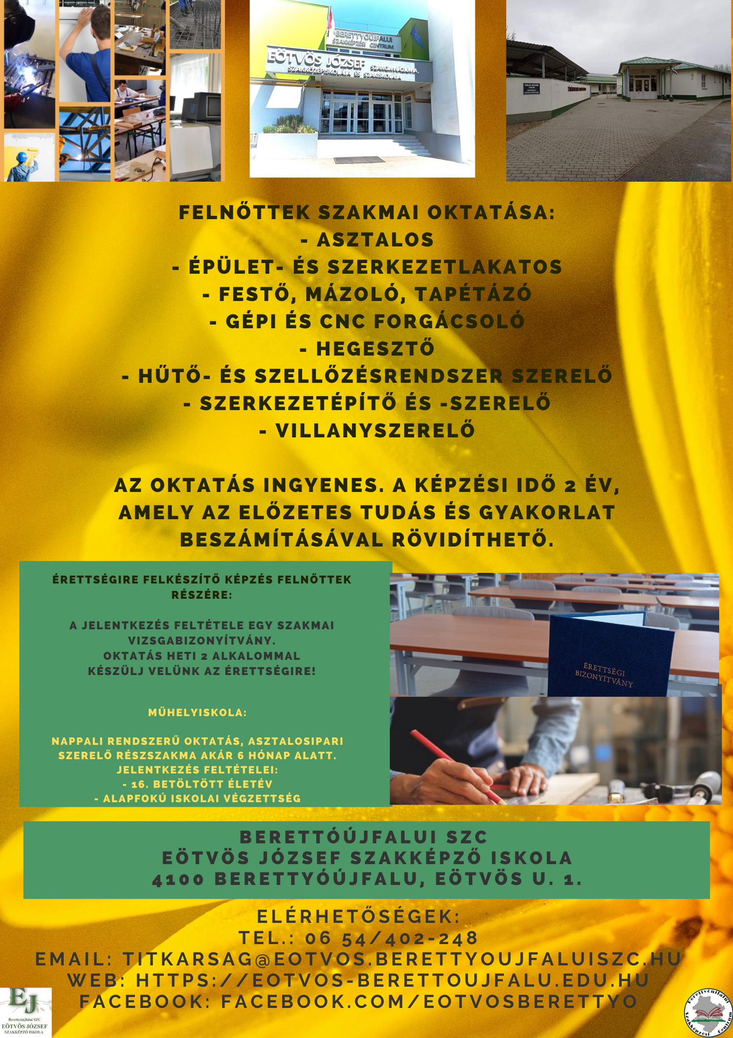 A Berettyóújfalui Szakképzési Centrum Eötvös József Szakképző Iskola érettségit adó képzést és ingyenes felnőtt szakmai oktatást indít a következő tanévben.