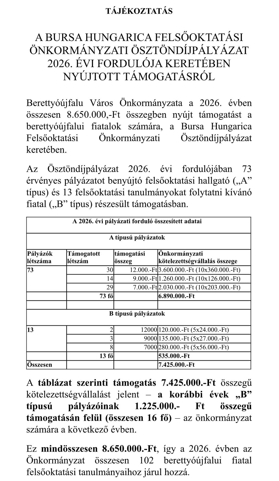 Berettyóújfalu Város Önkormányzata a 2026-os évben összesen 8.650.000 forint támogatással segíti a berettyóújfalui fiatalokat a Bursa Hungarica Felsőoktatási Önkormányzati Ösztöndíjpályázat keretében.