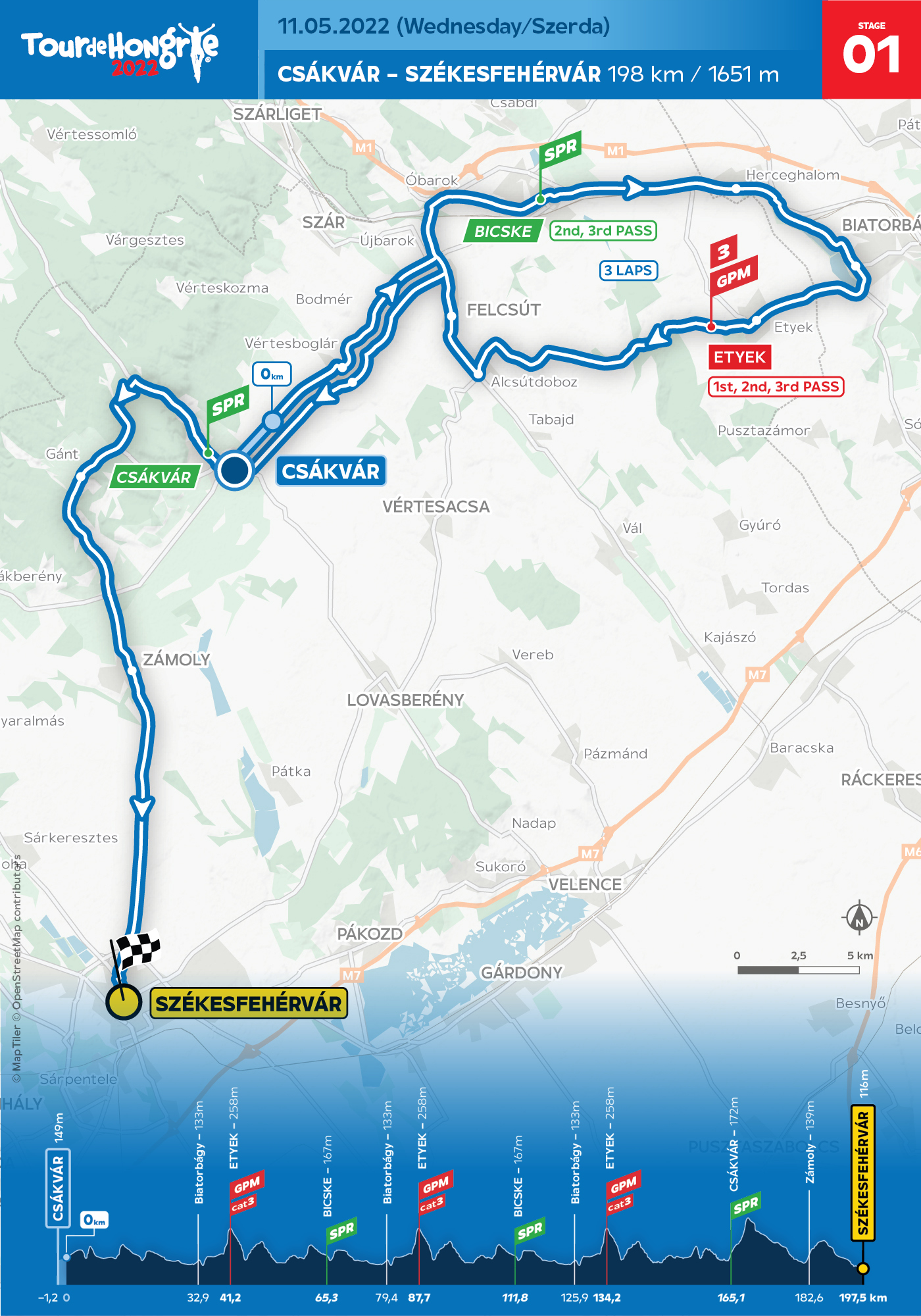 Május 11-én szerdán Csákvárról rajtol a 43. Magyar Körverseny. A mezőny Pest megye felé veszi az irányt, Felcsút, Bicske és Etyek érintésével, megkerülve a Biai tavat három kört tesz meg, mielőtt visszatér Csákvárra. Innen továbbhaladva a százkilencvennyolc kilométeres, dombos etap Székesfehérvár belvárosában, a Dózsa György úton ér véget. A 2022-es Tour de Hongrie első szakasza három gyorsasági és három hegyi részhajrát foglal majd magába.