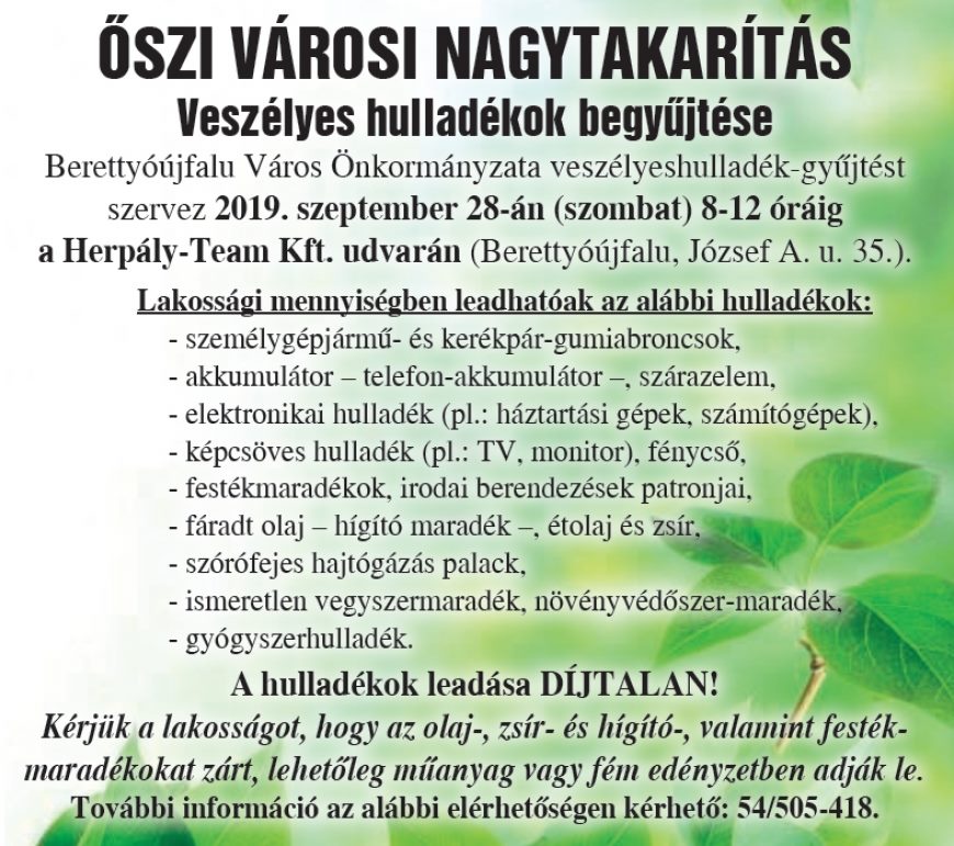 Berettyóújfalu Város Önkormányzata veszélyeshulladék-gyűjtést szervez 2019. szeptember 28-án, szombaton 8-12 óra között a Herpály-Team Kft. udvarán (Berettyóújfalu, József A. u. 35.).