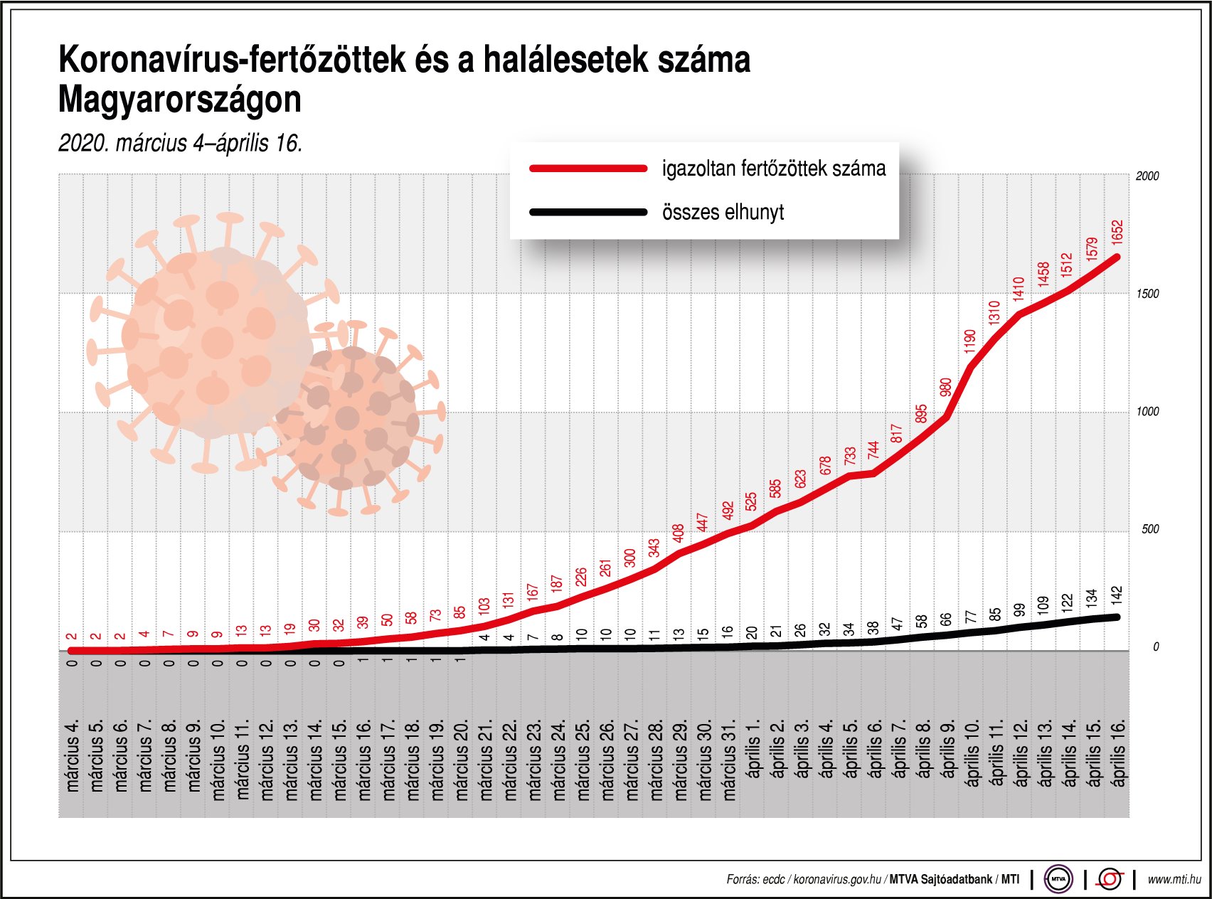 Újabb magyar állampolgároknál mutatták ki az új koronavírus-fertőzést (COVID-19), ezzel 1652 főre nőtt a hazánkban beazonosított fertőzöttek száma. Elhunyt újabb 8 többségében idős krónikus beteg. Ezzel 142 főre emelkedett az elhunytak száma, 199-en pedig már gyógyultan távoztak a kórházból.